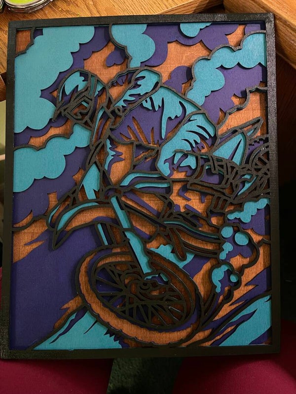 Dirt bike rider wood art